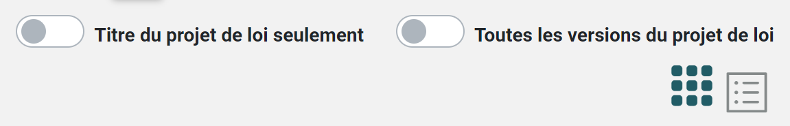 Activez le bouton Toutes les versions du projet de loi pour étendre votre recherche par mot clé aux versions antérieures du projet de loi (c. à d. en première lecture).